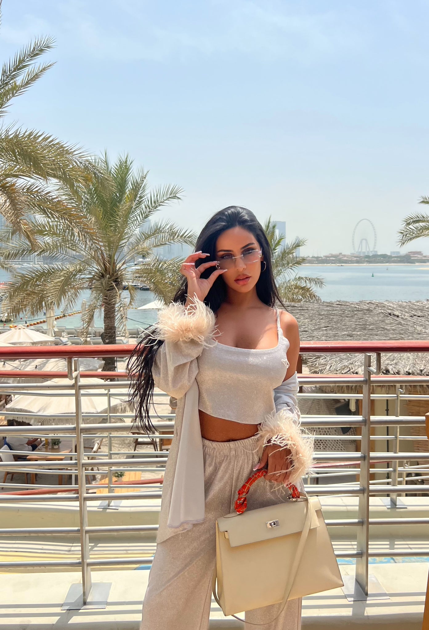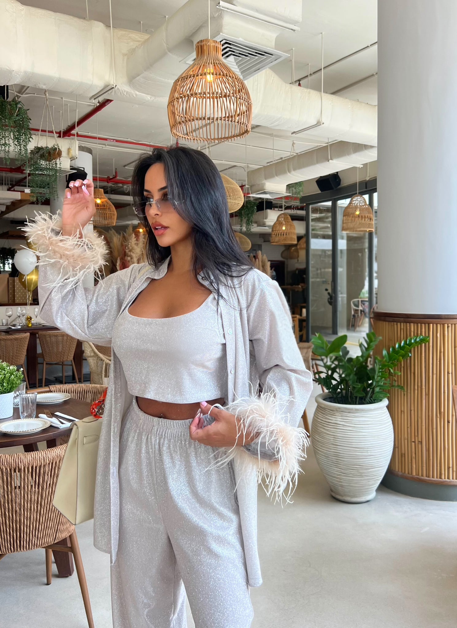Featuring a delicately tailored bralette, high-waisted fluid trousers, and a matching robe adorned with opulent feather-trimmed sleeves, this look balances sophistication with allure.
