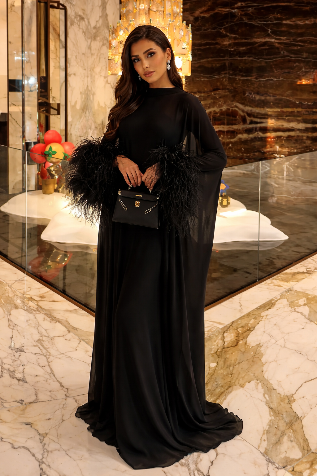 A luxurious two-piece creation featuring a fluid satin underdress and an airy outer layer adorned with exquisite feather accents. A statement of refined elegance and modern sophistication.